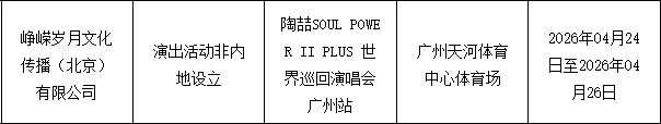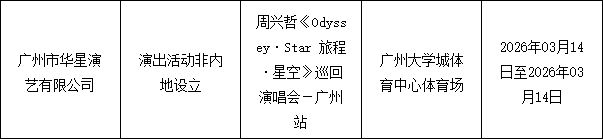 薛之谦万兽之王演唱会官宣 广州站即将开票!2026年3月20日至4月5日,韩庚将在广州举办「世界的角落」演唱会。同年5月23日,陶喆的SOUL POWER II PLUS世界巡回演唱会也将登陆广州。周兴哲的《Odyssey·Star 旅程·星空》巡回演唱会定于4月24日至26日在广州天河体育中心体育场举行。此外,3月14日,周兴哲还将在广州大学城体育中心体育场进行演出。